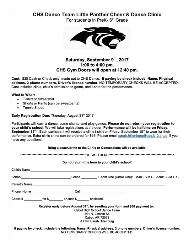 The CHS Dance Team Little Panther Cheer & Dance Clinic will be held Saturday, September 9th, in the CHS Gym for any girl in Pre-K through 6th grade. The girls will learn a dance, some chants, and play games. They will perform Friday night, September 15th, at the CHS vs JA Fair football game at half-time.