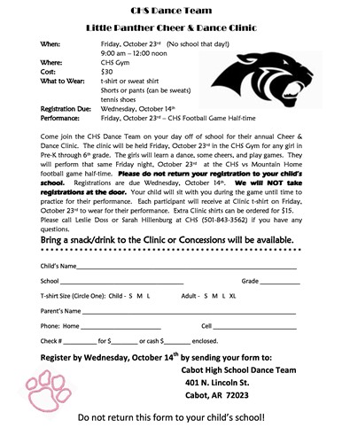 The Cabot High School Dance Team will host its annual 'Little Panther Cheer & Dance Clinic' Friday, October 23rd from 9am-12pm noon for any girl in Pre-K through the 6th grade. (There is no school this day)