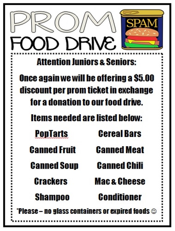 Students can receive a $5 discount on prom tickets if they make a contribution to the CHS food drive. Acceptable food items can be found here.
