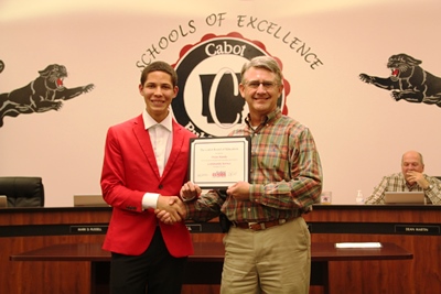 Dylan Handy is a senior at Cabot High School and is devoted to helping others. He helps feed the homeless in Little Rock with FishNet Ministries in Jacksonville, he helps collect and sort clothing for Hope's Closet in Cabot, and he spent a week with his youth group in Atlanta ministering to those in need. In fact, his youth group came to the board meeting to support Dylan.