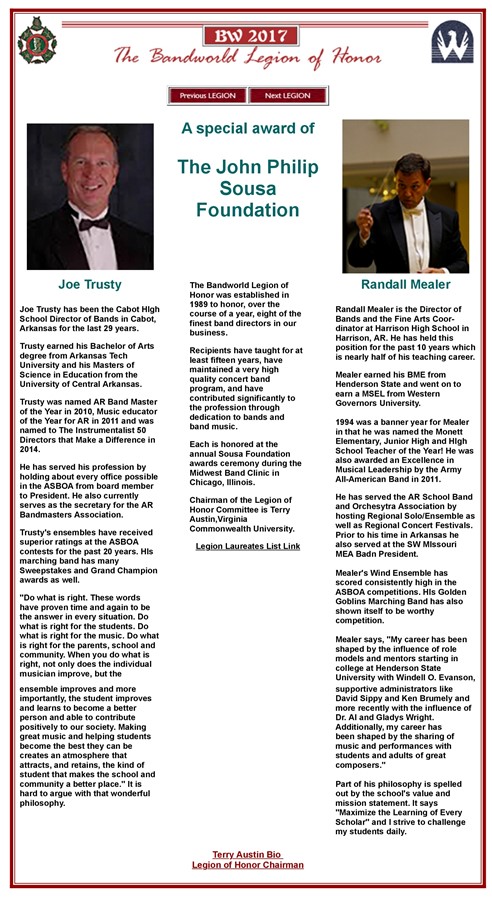 He will formally be inducted into the John Philip Sousa Foundation's Legion of Honor. This award is sponsored by the John Philip Sousa Foundation and Bandworld Magazine. He is officially a Legion Laureate now that his recognition is featured in the January issue of Bandworld Magazine.