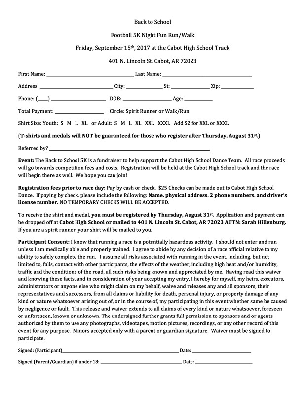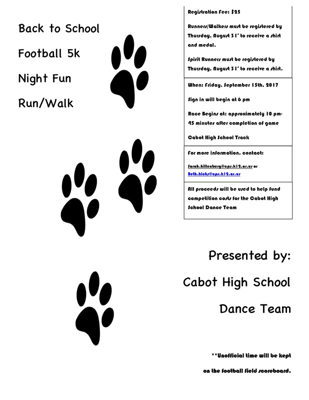 The Cabot High School Dance Team is hosting a Back to School Football Frenzy 5K Night Fun Run/Walk. The event will take place, Friday, September 15th, 2017.