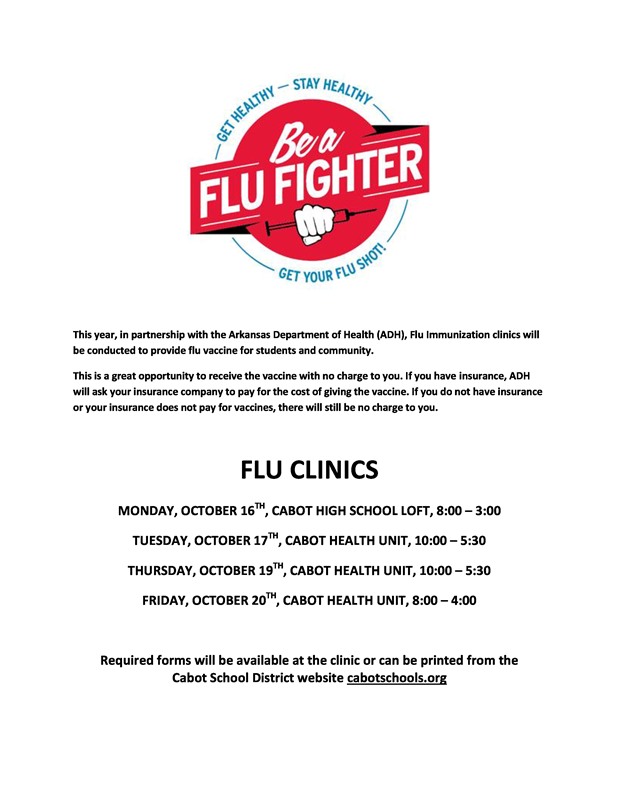 Click HERE to find more information on the Influenza Vaccine, plus read the Arkansas Department of Health's Privacy Notice. Please fill out the Health Department consent form and the School District consent form.