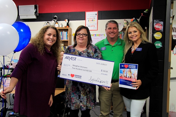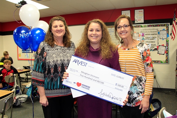 Congratulations to Cabot Middle School North's 5th grade science and social studies teacher Meaghan Sitzmann! She was recently surprised with a $500 check from Arvest Bank to purchase supplies for her classroom.