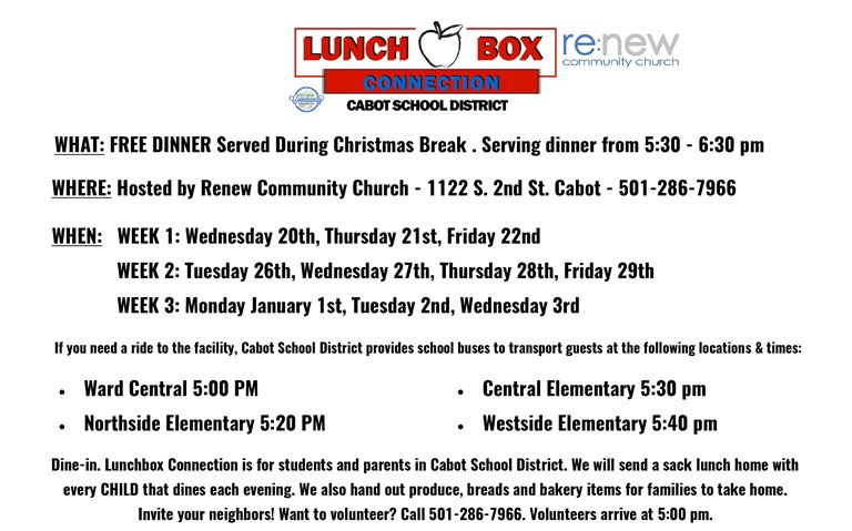 Lunchbox Connection is for students and parents in the Cabot School District. A sack lunch will be sent home with every child that dines each evening.