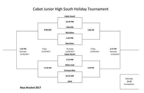 The Cabot Junior High South Holiday Tournament will be hosted at the CJHS gym from Dec. 28-30 and brackets can be found here - GIRLS and BOYS. Admission is $4.00 per person.