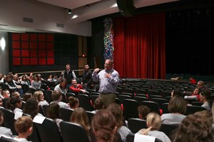Before being recognized on the basketball court, students gathered in the Fine Arts Auditorium to hear from district leaders. Superintendent Dr. Tony Thurman welcomed the students, along with Cabot Panther Foundation member Dr. Brent Larsen.
