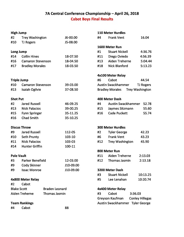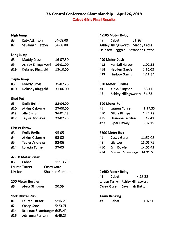 Cabot High School recently competed in the 7A Central Conference Championship Meet where students from across Central Arkansas showcased their talents in several field and running events.