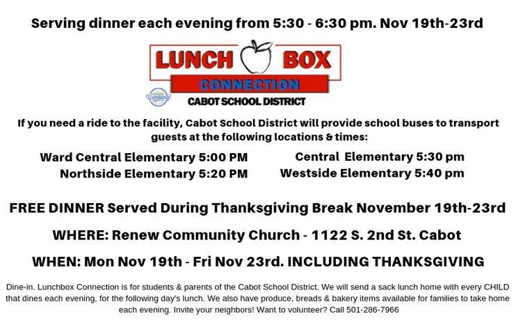 Lunchbox connection is for students and parents in the Cabot School District. A sack lunch will be sent home with every child that dines each evening.