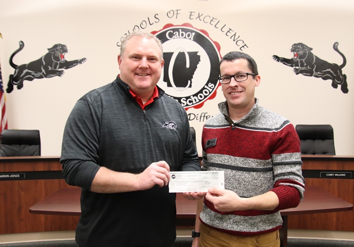 The Cabot School District received an early holiday present. First Electric Cooperative Marketing and Development Representative David Copeland presented the district with a capital credit refund check in the amount of $29,533.05.