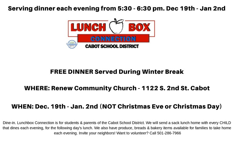 Lunchbox Connection is for students and parents in the Cabot School District. A sack lunch will be sent home with every child that dines each evening.