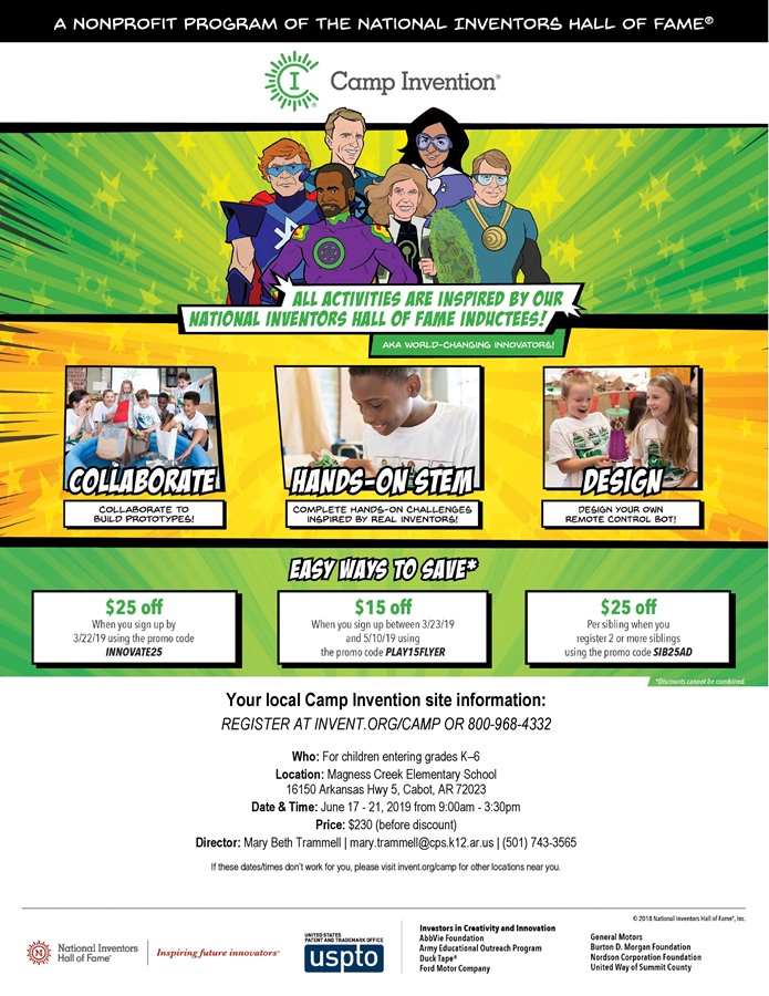 Camp Invention will be held June 17-21 at Magness Creek Elementary from 9:00 a.m.–3:30 p.m.