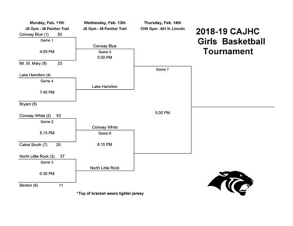 The junior high conference tournament continues today, February 13th, and will be at both Cabot Junior High North and South gyms. The championship games will be played Thursday, February 14th at CHS Panther Arena.