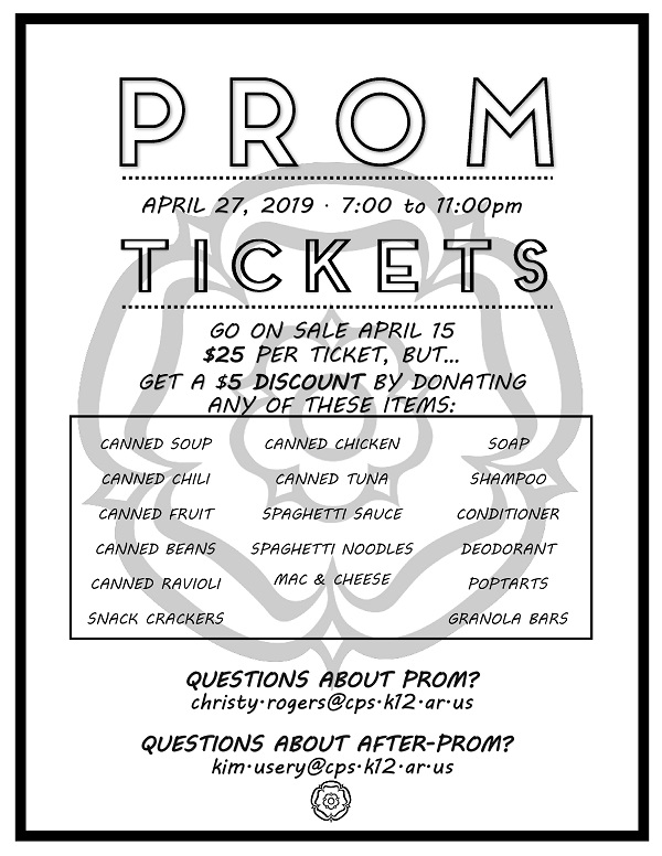 Prom tickets will go on sale Monday, April 15th at the CHS office and will be sold before school and during lunch. Tickets are $25 each, but students can receive a $5 discount per ticket by contributing to the food drive.