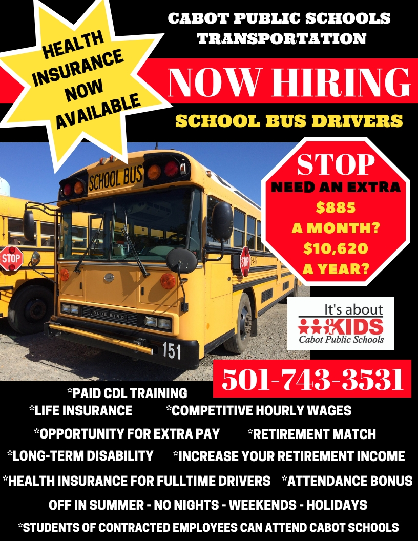 The Cabot School District is offering a new incentive to full-time bus drivers. Health insurance coverage will now be available beginning in August 2019!