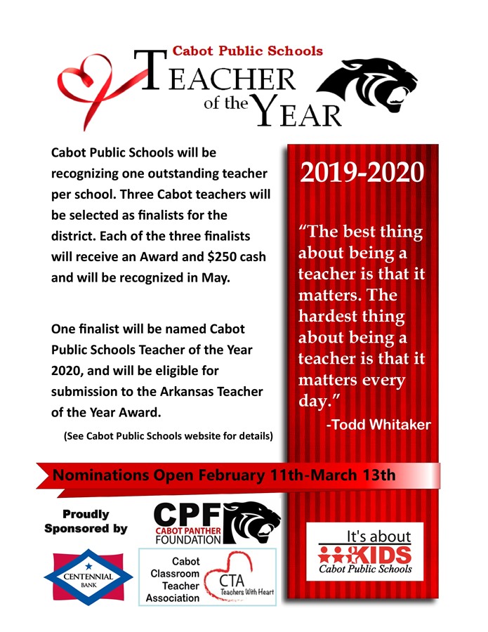 Cabot Public Schools Teacher of the Year 2019-2020 - Nominations Feb. 11 - March 13