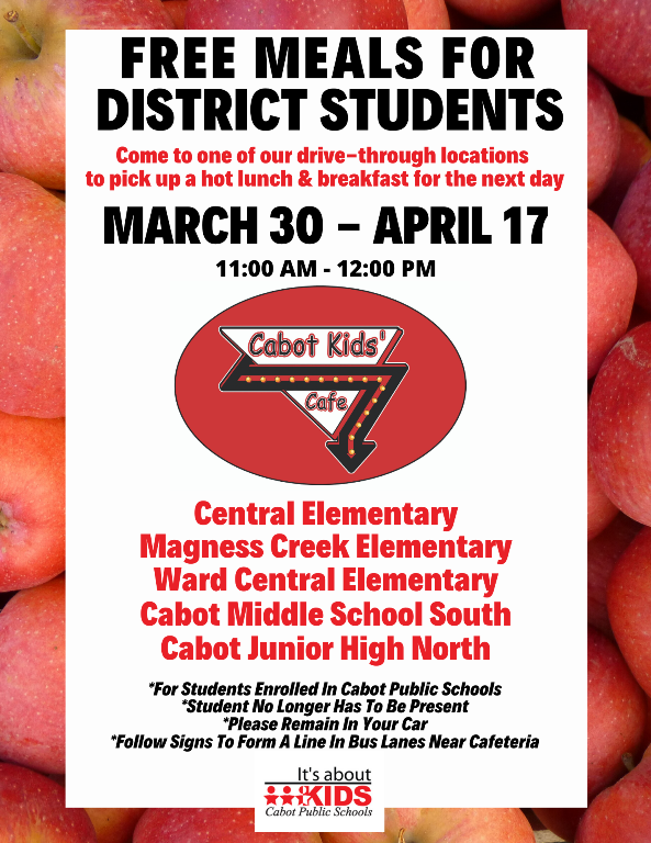 Cabot Public Schools is offering a free drive-through meal program from March 30 – April 17. The Cabot Kids' Café will be available Monday through Friday, from 11:00 a.m. – 12:00 p.m. at five different school locations.