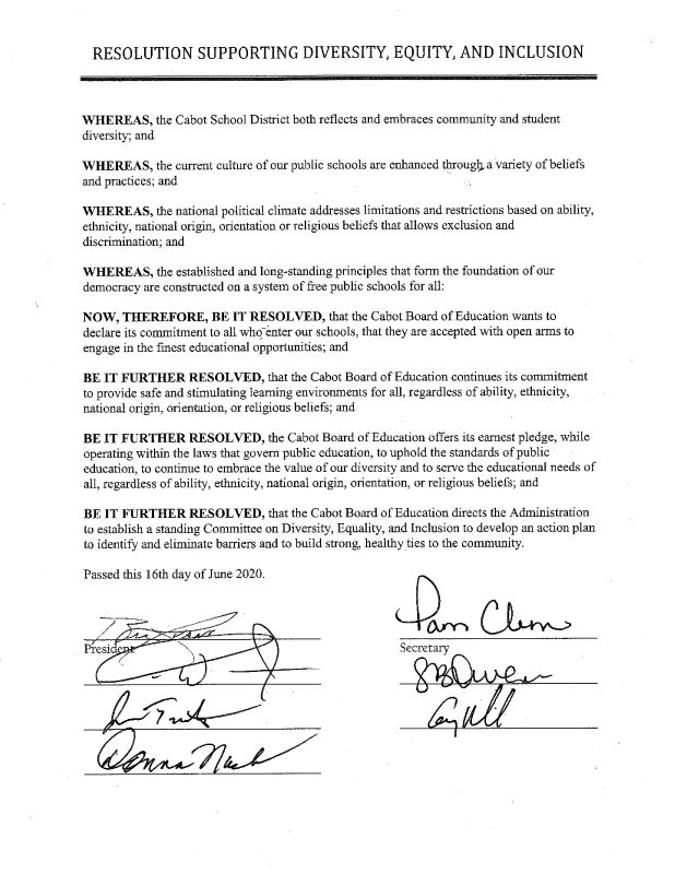 You may remember at the June 16, 2020 school board meeting, the Cabot School Board adopted a resolution supporting diversity, equity, inclusion and condemning discrimination in every form. Included in the resolution was the creation of the Diversity, Equity, and Inclusion Committee.