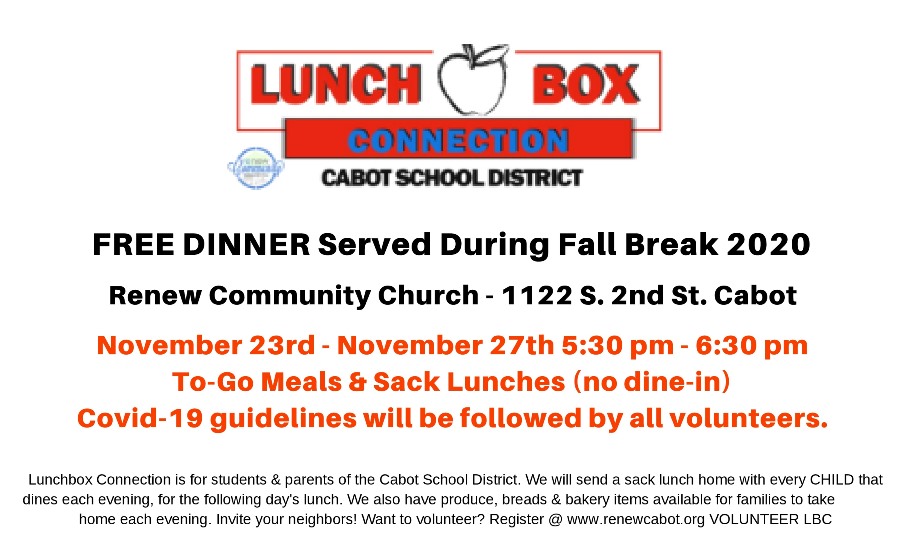 Lunchbox Connection will provide the meals on November 23-27 from 5:30 p.m.-6:30 p.m. each night at Renew Community Church which is located at 1122 S. 2nd Street in Cabot.
