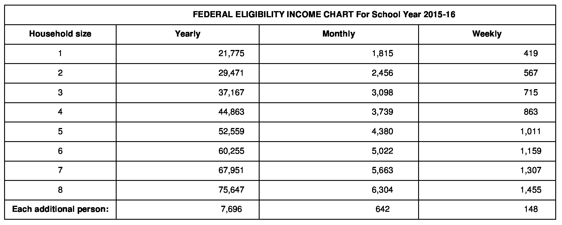 Children may receive free or reduced price meals if your household's income is within the limits on the Federal Income Eligibility Guidelines. Your children may qualify for free or reduced price meals if your household income falls at or below the limits on this chart.