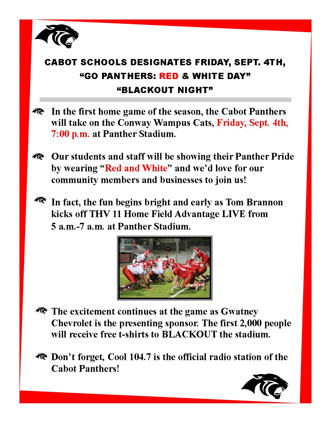Friday, Sept. 4th is a big day here at the Cabot School District. We want to encourage everyone to show their Panther Pride by wearing "Red & White!"