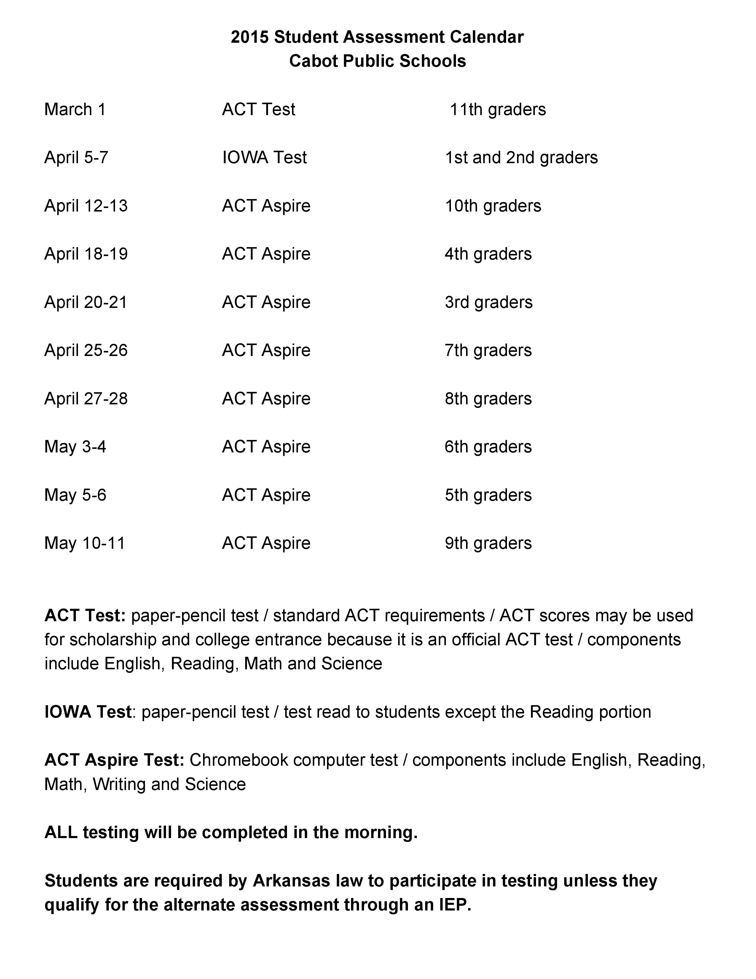 Dates for the ACT Test, IOWA Test and ACT Aspires tests, as well as, information about the tests are listed below.