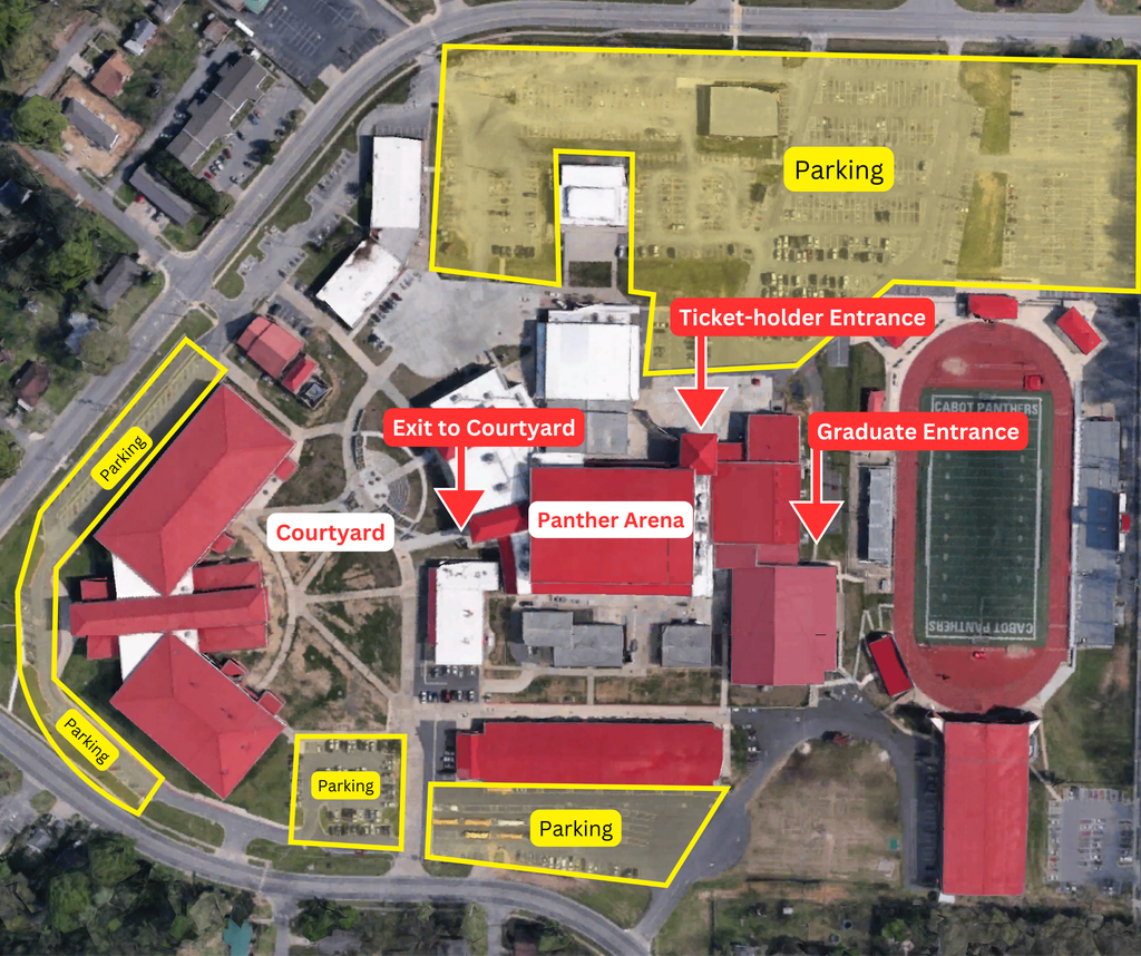 Expect delays in the area of Cabot High School. In addition to the main student parking areas, we encourage parking in the bus and faculty areas near Champs Hall and around the front of Cabot High School. Additional parking areas include, Central Administrative Office, Freshman Academy, and Cabot Junior High North. Please observe any specific areas that might be barricaded or reserved.