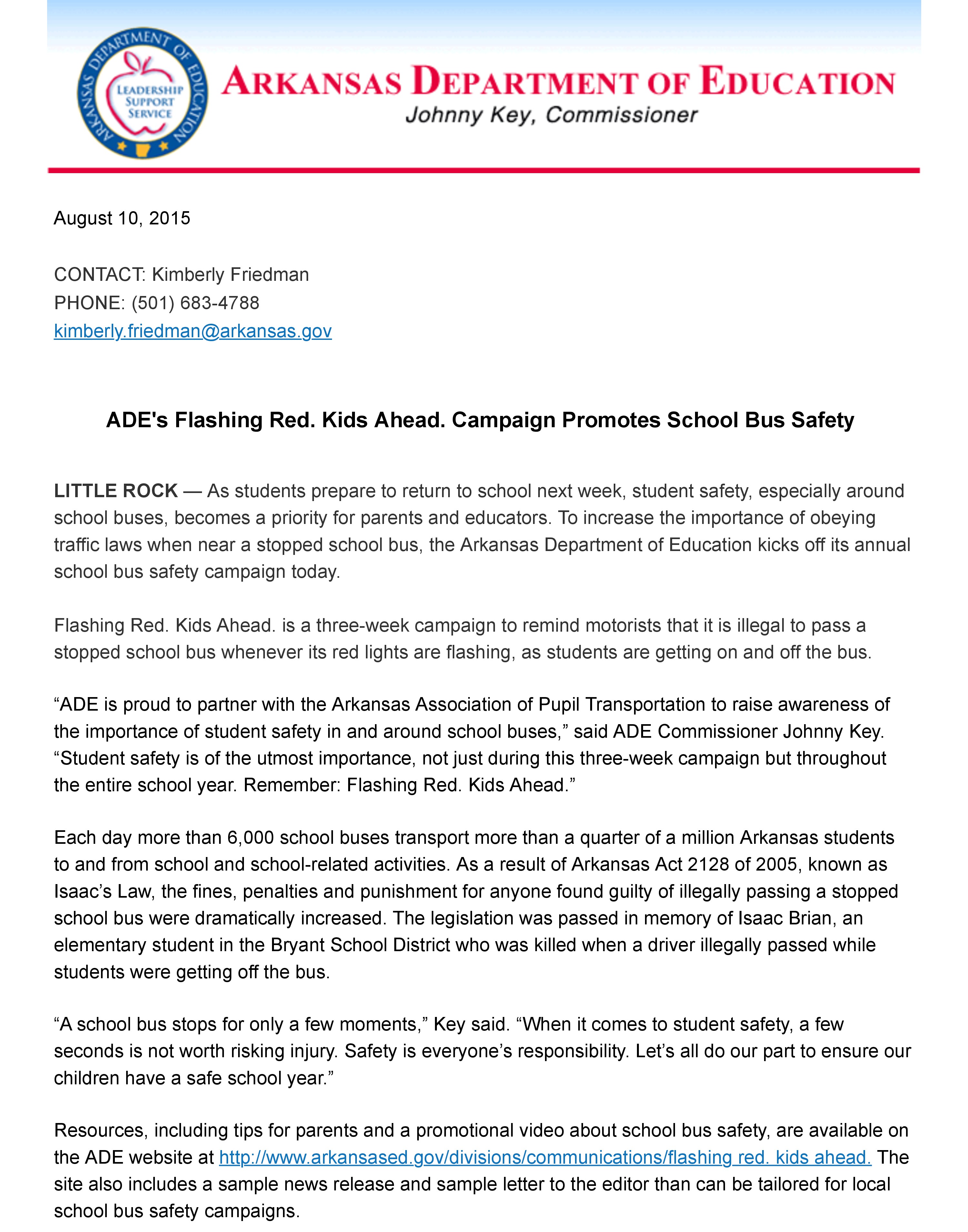 Below is a press release from the Arkansas Department of Education on its most recent campaign to promote school bus safety.