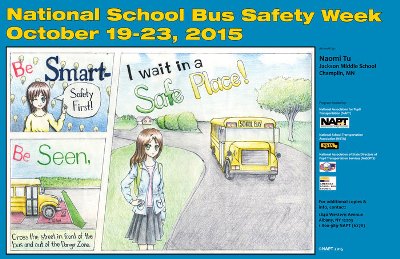 The 2014 Winning Poster/2015 National School Bus Safety Week theme is: "Be Smart - Be Seen, I wait in a safe place!"