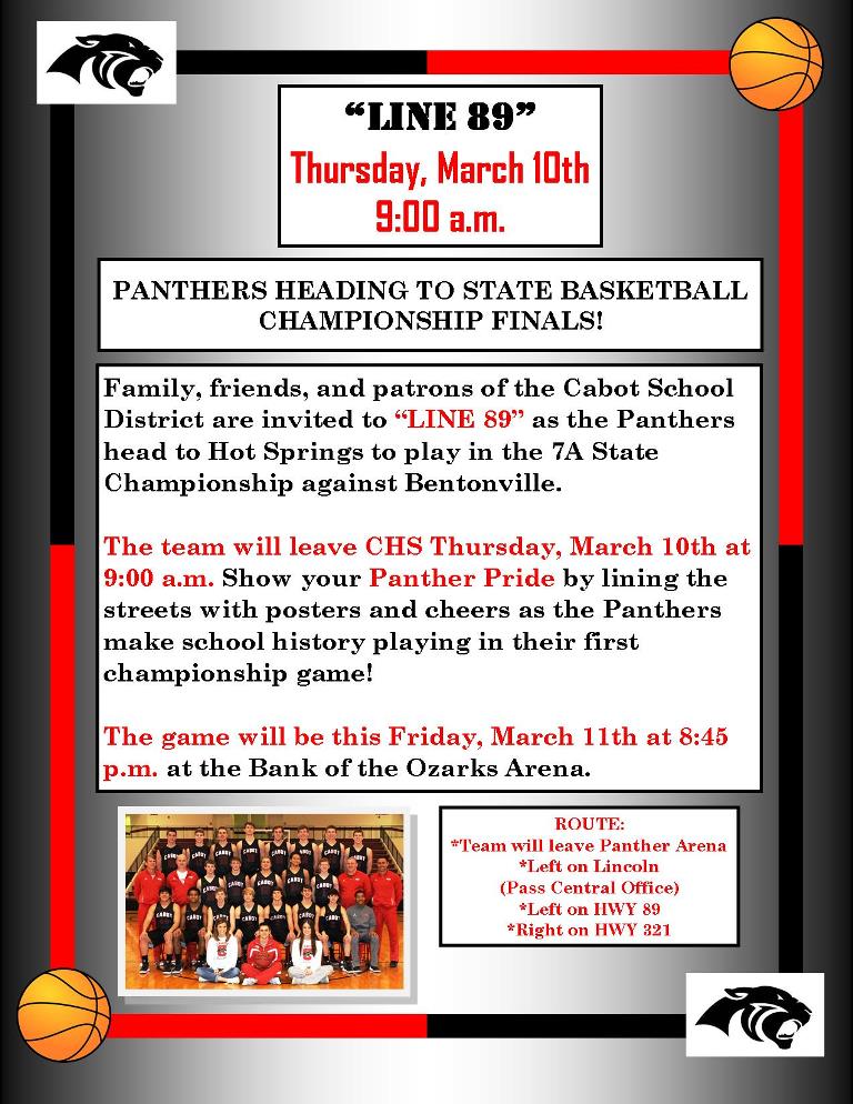 The team will leave at 9:00 a.m., Thursday, March 10th. Family, friends, and the community are invited to “LINE 89” as the boys board the bus headed for the state championship game.