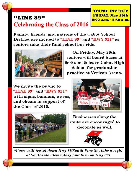 The second "LINE 89" celebration takes place Friday, May 20th. Seniors will board buses at 8:00 a.m. for the final time and head to Verizon Arena for practice. Buses will head down HWY 89 South Pine and turn on Hwy 321.