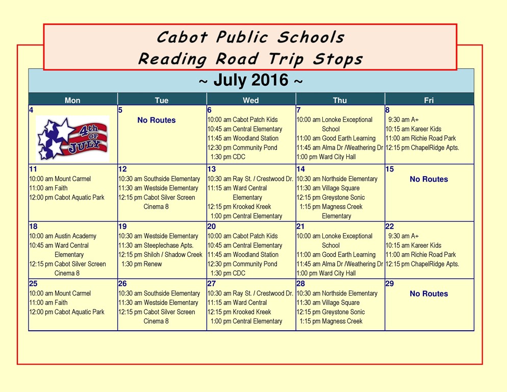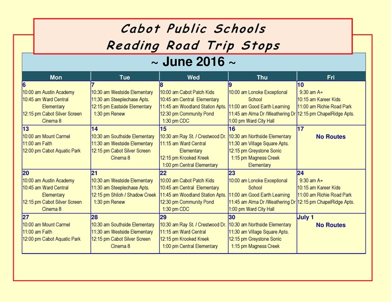 The Reading Road Trip Bus will travel around the Cabot School District from June 6 through July 28 allowing children and their families to check out books.