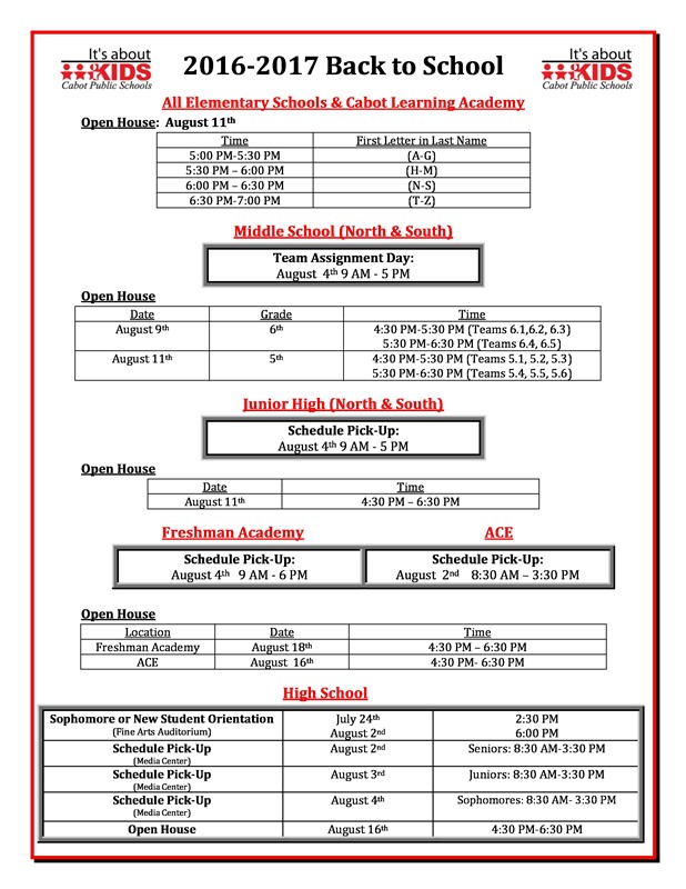 The 2016-2017 Back to School Schedule for elementary, Cabot Learning Academy, middle school, junior high, Freshman Academy, ACE and the high school is now available.