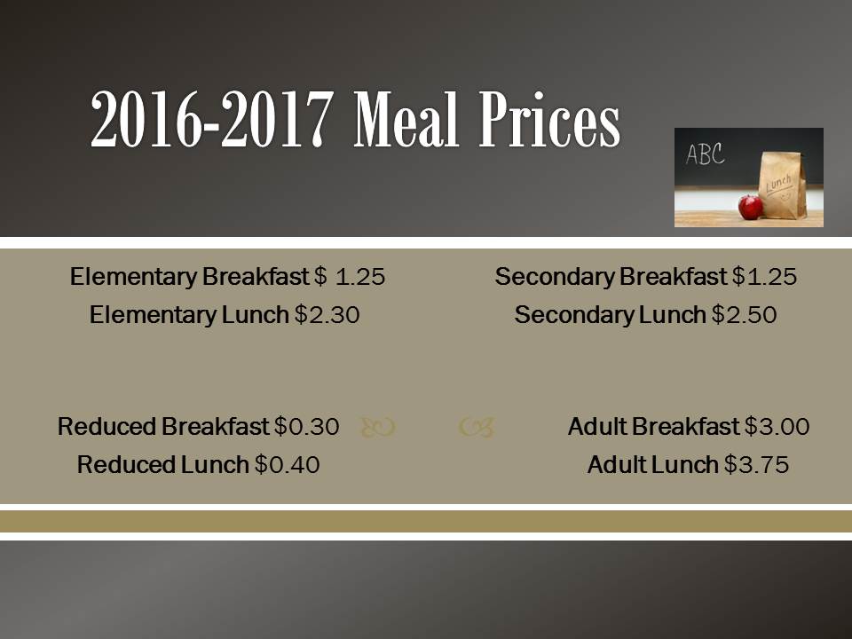 Below are the meal prices for the 2016-2017 school year. You may notice there is a slight increase in the elementary and secondary lunch prices.