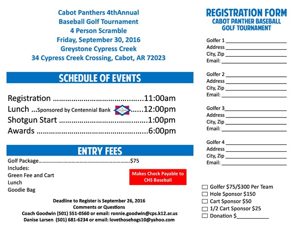Rain or shine the Cabot High School Baseball Team will host their 4th Annual Golf Tournament to help raise funds for team equipment and maintenance. The funds raised will go towards buying apparel, uniforms, and equipment such as baseballs, helmets, catchers gear, and other training equipment for our student athletes.