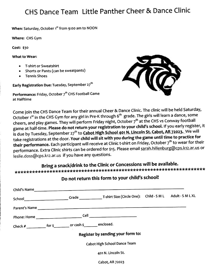 The clinic will be held Saturday, Oct. 1st in the CHS Gym for any girl in Pre-K through 6th grade. The girls will learn a dance, some cheers, and play games. They will perform Friday night, October 7th at the CHS vs Conway football game at half-time.