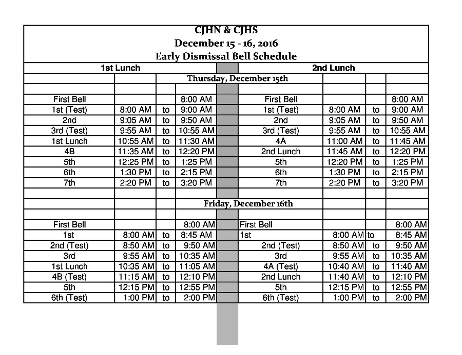 CJHN and CJHS will follow the same schedule. (There is a slight difference from the other schedule due to dismissal and lunches.)