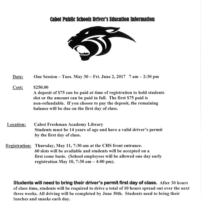 One Driver's Education session will be held on Tuesday, May 30 to Friday, June 2, 2017 from 7:00 a.m. to 2:30 p.m. at the Cabot Freshman Academy Library.