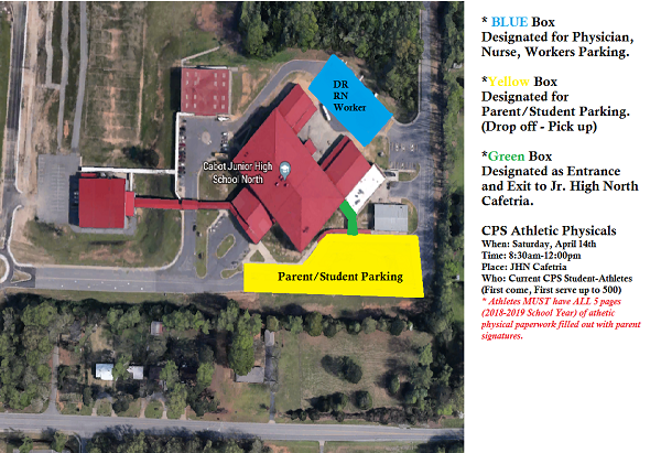 Due to several events going on at Cabot High School on Saturday, April 14, the student-athlete physicals location has been changed from the CHS Fieldhouse to the Cabot Junior High North cafeteria.