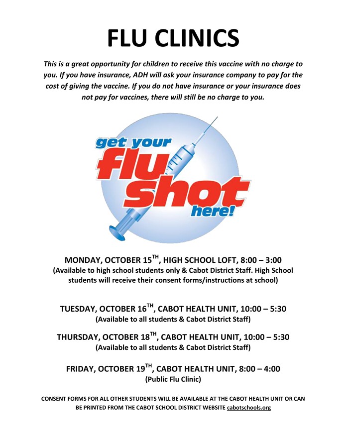 Click HERE to find more information on the Influenza Vaccine, plus read the Arkansas Department of Health's Privacy Notice. Please fill out the Health Department consent form and the School District consent form.