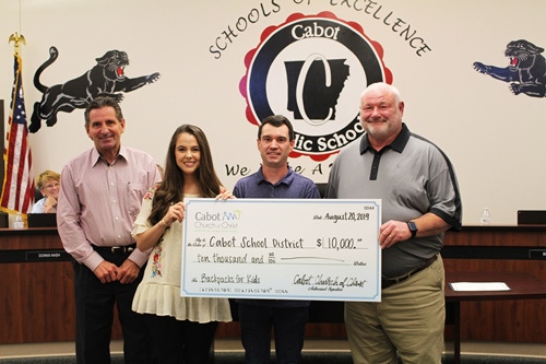 The Backpack for Kids program was started by Cabot Middle School South teachers Becky and Chester Brown. They felt a calling to give back and help students in need. They took their cause to their congregation and church members have been donating to the program ever since. Cory Spruiell, Outreach Minister at Cabot Church of Christ, Shepard Greg Bulice, and Emily Taylor who coordinated the drive with her husband, attended the board meeting to present the donation.