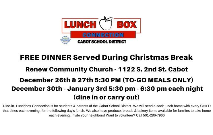 Lunchbox Connection will be serving the dinners on the dates and times below at Renew Community Church which is located at 1122 S. 2nd Street in Cabot.