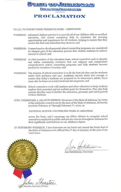Governor Asa Hutchinson has proclaimed the week of February 3-7, 2020 as National School Counselor Week in Arkansas.