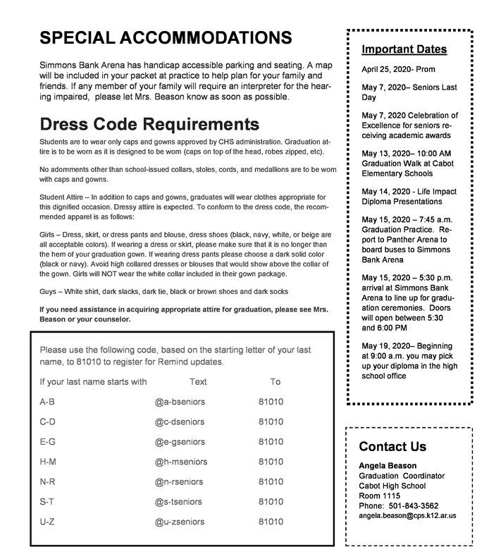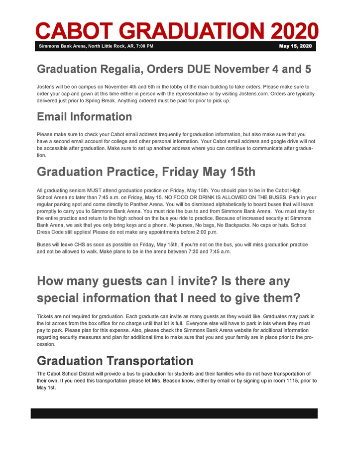 Below is information that has been given to your senior. It has information on what to expect, graduation practice, dress code, important dates, etc. You can also click HERE for the information.